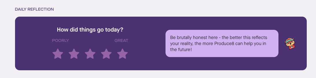 To start, your team members can log into Produce8 each morning and fill out the Morning Journal . They can reflect on the previous day now that they’ve had time to think it over, then leave a comment to explain their rating or set their goals for the workday.